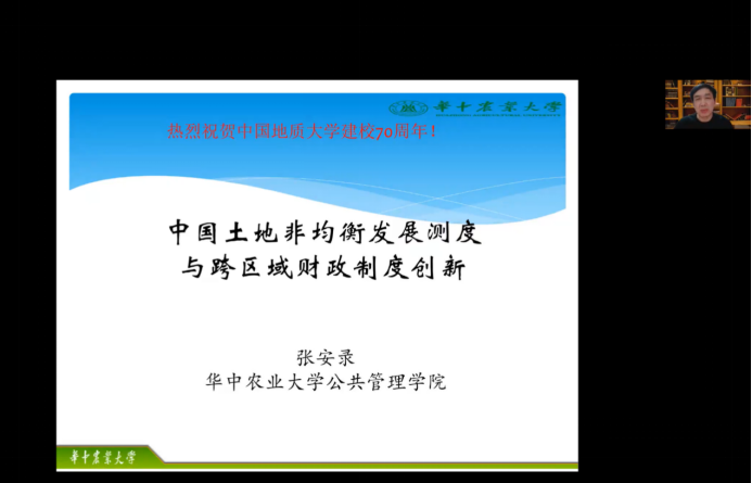 (通讯员 柴季 王昭君)11月3日晚19时,华中农业大学太阳成集团tyc234cc主页教授、博士生导师、长江学者特聘教授、教育部新世纪优秀人才张安录教授应太阳成集团tyc234cc主页王占岐教授、经理胡守庚教授邀请,为公司师生带来主题为“中国土地发展非均衡测度及跨区域财政转移制度创新”的线上学术讲座。本次讲座由公司王占岐教授主持,来自校内外的300余名师生线上线下参加。