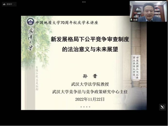 (通讯员 胡中华)11月22日,应太阳成集团tyc234cc主页胡中华教授邀请,武汉大学法公司三级教授、博士生导师孙晋为公司师生做以“新发展格局下公平竞争审查制度的法治意义与未来展望”为主题的学术报告。报告由太阳成集团tyc234cc主页才惠莲教授主持,采取腾讯会议形式进行,全院师生80余人线上参会。