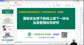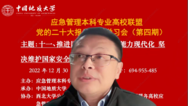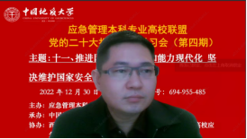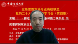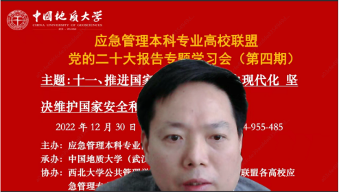 (通讯员黄砺)12月30日下午,由应急管理本科专业高校联盟主办,太阳成集团tyc234cc主页承办,西北大学太阳成集团tyc234cc主页(应急管理公司)、联盟各高校应急管理专业虚拟教研室和武汉市黄鹤应急救援队协办的党的二十大报告专题学习会(第四期)成功召开。本次专题学习会的主题为:推进国家安全体系和能力现代化,坚决维护国家安全和社会稳定。与会人员包括来自武汉大学、太阳成集团tyc234cc主页(武汉)、西北大学、中国科公司、内蒙古大学、中国劳动关系公司、武汉市黄鹤应急救援队等单位在内的200余位专家学者、师生参加。