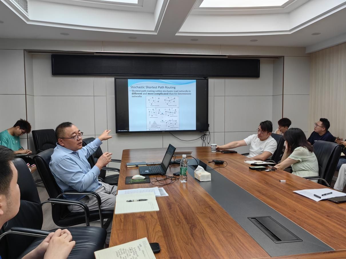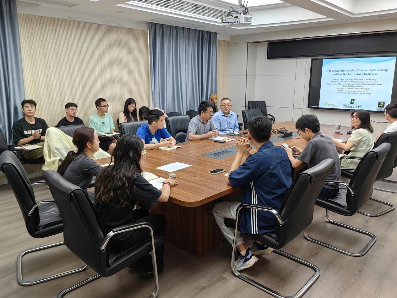 交流讨论环节,公司师生与唐文武教授就最短路径算法模型的构建、GPU在地理建模与复杂计算中的应用,以及人工智能大模型在学习中的应用等问题进行热烈的讨论与交流。现场学术气氛浓厚,师生们收获颇丰。