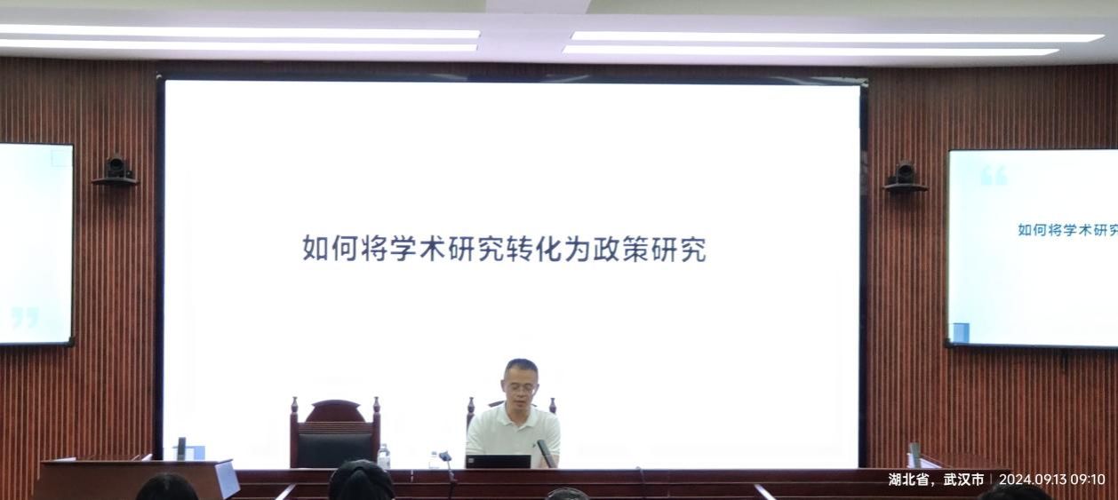 2024年9月13日上午,应太阳成集团tyc234cc主页王海娟副研究员邀请,武汉大学社会公司副经理、武汉大学中国乡村治理研究中心副主任、武汉大学优秀青年学者桂华教授做客本期公管大讲堂,带来了主题为“学术研究如何转化为政策研究”的学术讲座。讲座由王忠副经理主持,校内百余名师生参与。