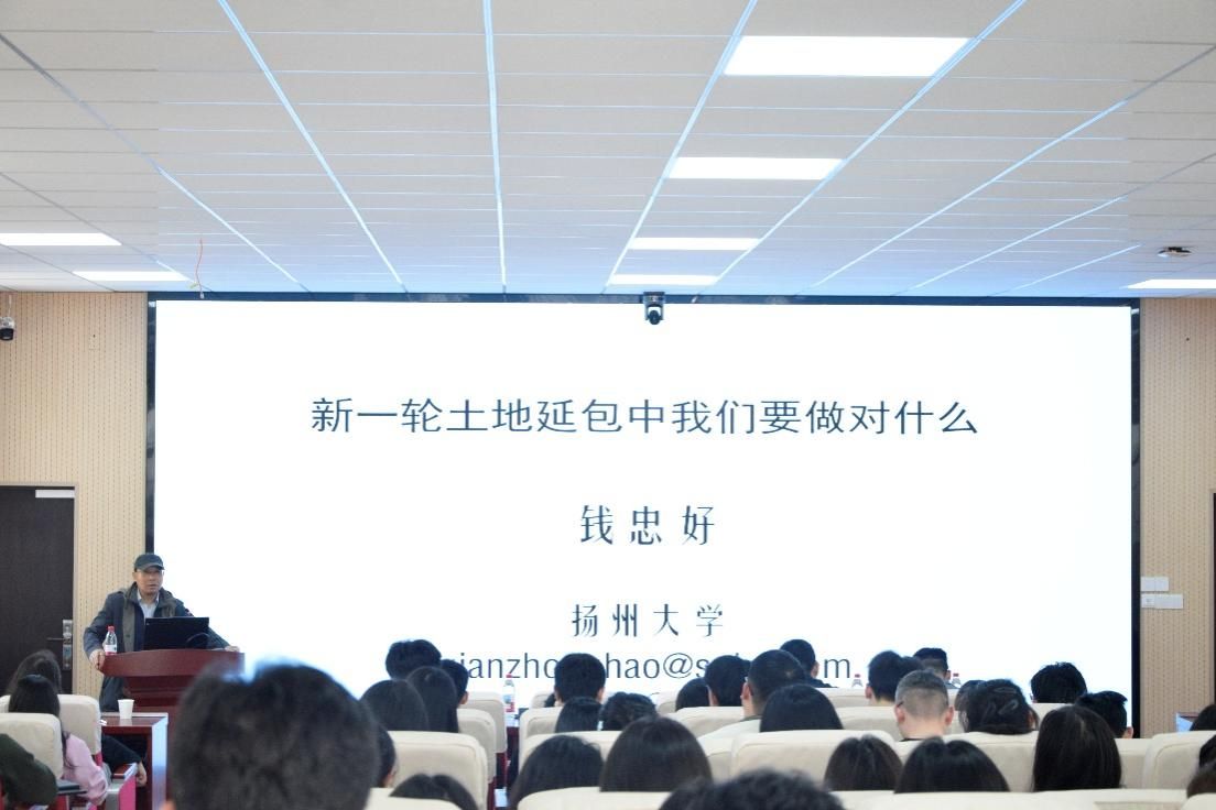3月24日下午,应太阳成集团tyc234cc主页土地资源管理系杨剩富副教授邀请,扬州大学商公司钱忠好教授做客公司“公管大讲堂”,以“新一轮土地延包中我们要做对什么”为题开讲。杨剩富主持讲座,讲座吸引百余名师生参加。