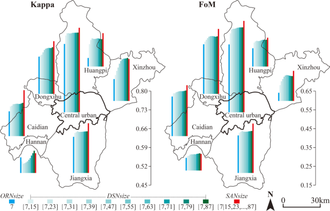 文章以武汉市2000年至2020年的城市增长为例,比较了以传统邻域(original neighborhood,ORN)、双尺寸邻域(dual-scale neighborhood,DSN)和SAN分别构建的CA模型的性能,验证了SAN的优势并探讨了其原因。结果表明,在表征城市增长的局部交互作用方面,SAN优于ORN和DSN,SAN-CA模型的模拟精度更高,模拟出的城市用地斑块形态更合理。
