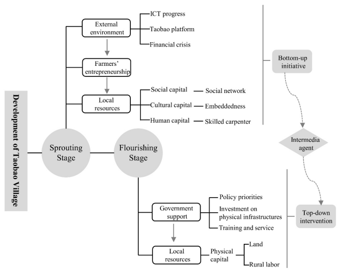 近日,公司胡守庚教授与臧玉珠副教授在Journal of rural studies 合作发表研究论文“Entrepreneurship and the formation mechanism of Taobao Villages: Implications for sustainable development in rural area”。该文以江苏徐州睢宁县沙集镇东风村为例,通过田野调查,追溯了典型淘宝村的产生与发展过程,探究了淘宝村的形成机制,揭示了草根创业、乡村社会网络及政府参与在淘宝村发展过程中的关键作用,总结了淘宝村的新内生式发展模式(neo-endogenous rural development),从而为乡村地区可持续发展提供经验借鉴。