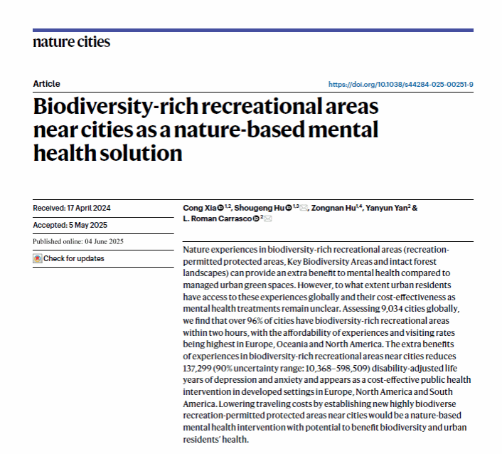 论文引用:Xia, C., Hu, S., Hu, Z. et al. Biodiversity-rich recreational areas near cities as a nature-based mental health solution. Nat Cities (2025). https://doi.org/10.1038/s44284-025-00251-9