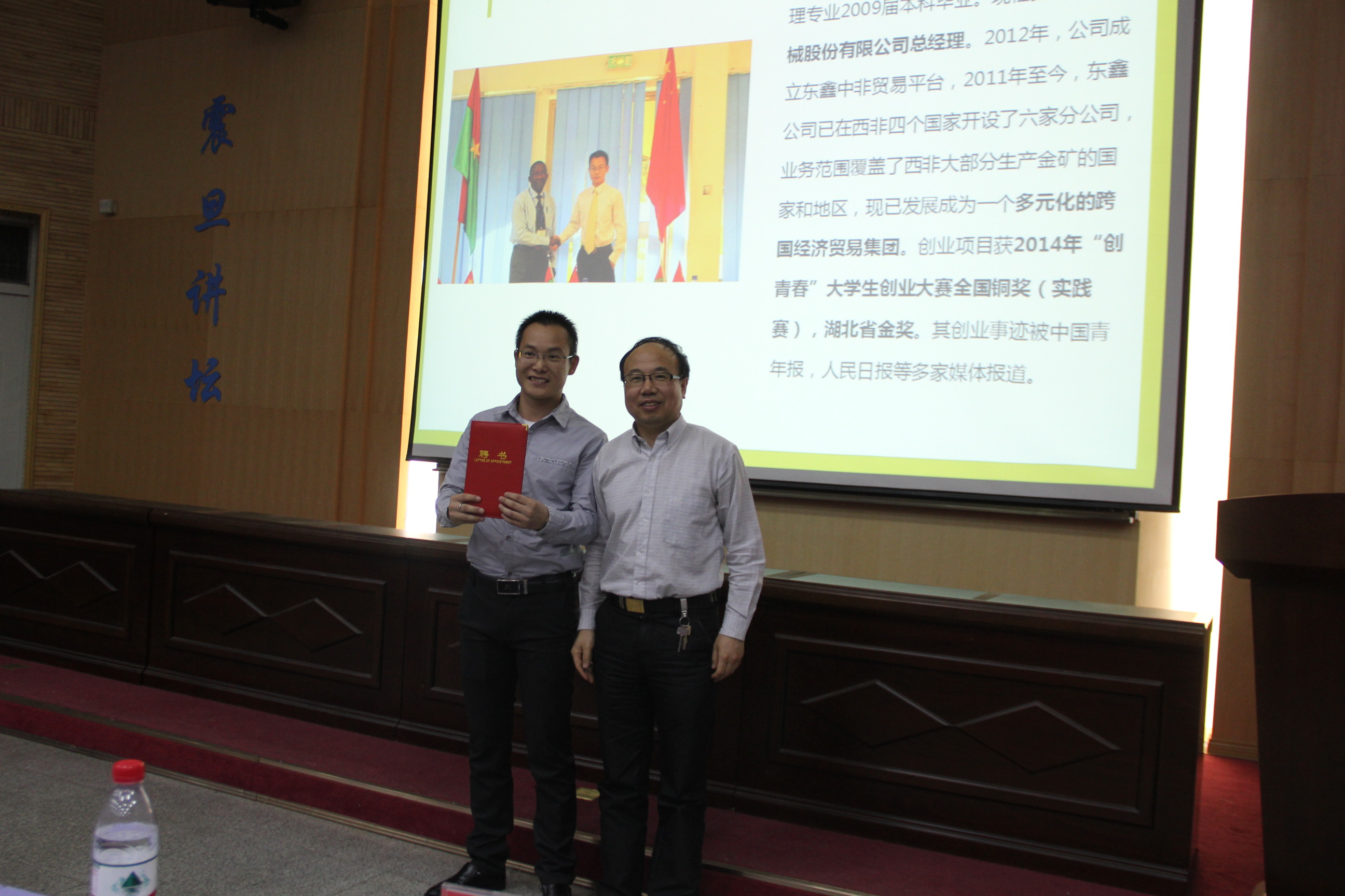 胡文勤老师担任主持,他首先介绍了主讲人郭林的创业事迹,并对其返校为全校师生作报告表示欢迎与感谢。随后,由张吉军老师代表公司为其颁发了“太阳成集团tyc234cc主页老员工创业导师”聘书。在全场师生热烈的掌声中,郭林员工以“我的大学与非洲创业之路”为主题进行演讲,分享了他的求学、求职和创业之路。