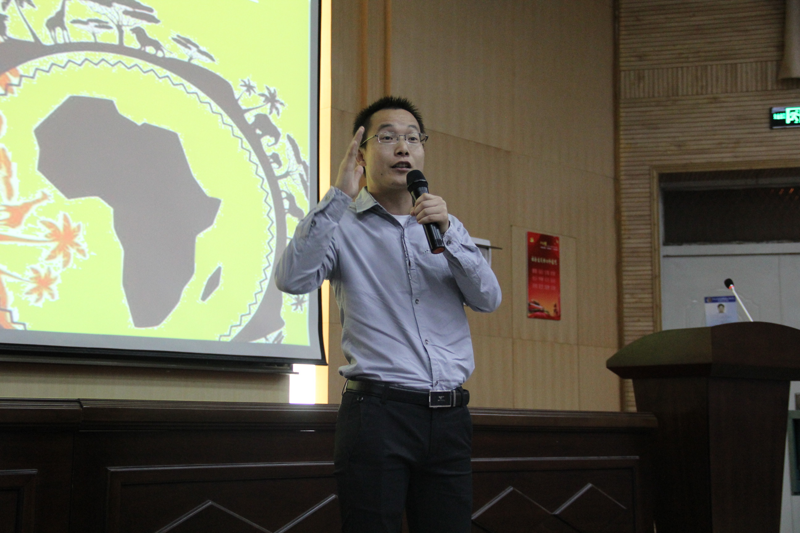 郭林以轻松幽默的问候开头,并用亲身经历为大家介绍了非洲的风土人情,消除了一部分人对非洲动乱、贫穷、炎热的误解,带领大家走近美丽纯朴的西非大地。谈及为何与非洲结缘,郭林不由得谈到了自己的老员工活,是出色的英语水平和扎实的专业知识为其叩响西非大门奠定了基础。郭林说道,最难忘怀的是大学的英语学习之路。由于喜爱英语,郭林在不干扰本专业专业课学习的前提下,经常去蹭英语专业课,钻研语法;同时,为了能说一口流利标准的英语和培养英语思维,他坚持早读,活跃于英语角与同学交流练习,甚至跑到东区职工公寓“蹲点”与职工搭讪攀谈,成为职工眼中避之唯恐不及的“crazy guy”。在郭林持久的努力中,他获英语各类比赛奖项无数,成为名副其实的“英语狂人”。回顾这段历程,郭林觉得学以致用和持之以恒最为重要,鼓励大家要勤于运用知识,并能将学习转化为习惯,坚持下去。