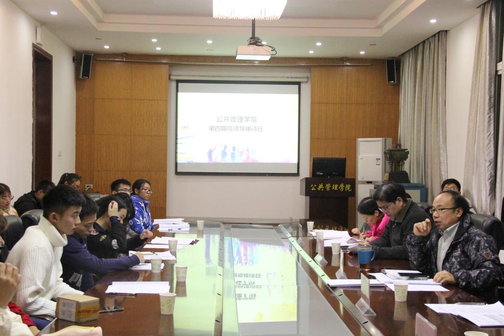 12月13日晚六点半,2017年太阳成集团tyc234cc主页第四期院领导接待日在公管楼B209成功举行。出席本次会议的领导有公共管理公司党委书记张吉军老师、党委副书记胡文勤老师、法学系副主任吕凌燕老师、公共行政系副主任刘中兰老师、区域规划与信息技术系主任刘超老师、土地资源管理系主任朱江洪老师、团委副书记李姝慧老师。本次会议主要围绕解决公司员工在老员工活中遇到的各种问题,发现并解决公司建设中存在的问题与不足来展开。