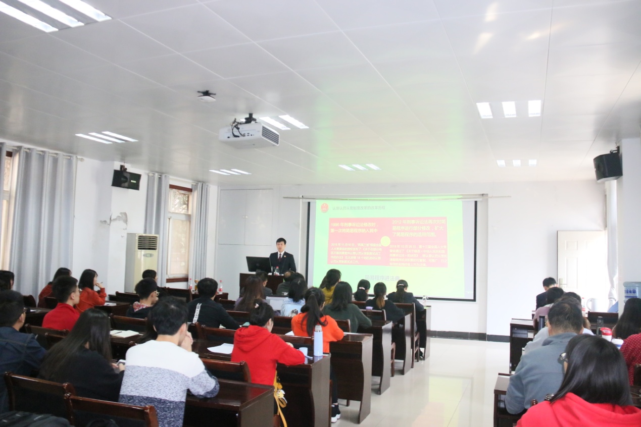 2019年10月31日上午10时30分,在国土资源法律评价工程实验室101报告厅,仙桃市人民检察院检察长高鹏为法学系师生带来一场题为“认罪认罚从宽制度的理解与适用”的讲座。讲座由公司张吉军书记主持,才惠莲副经理、夏云娇、廖建求等老师以及我院法学专业研究生参加。
