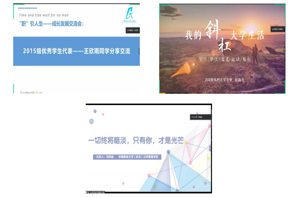 会议开始,王欣雨、彭逸伦、马伟蕊三位学长学姐首先做分享。王欣雨学姐为大家寻找员工工作和兴趣爱好的平衡点支招;彭逸伦学长主要介绍了保研经验和提升时间利用效率的方法;马伟蕊学姐则从科研科创活动的角度为同学们的未来规划提供参考方向。三位学长学姐分享内容丰富,使大家受益匪浅。分享后提问环节大家踊跃和学长学姐们进行了提问交流。