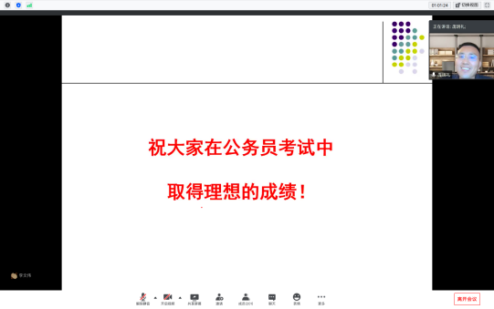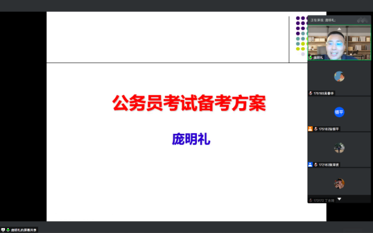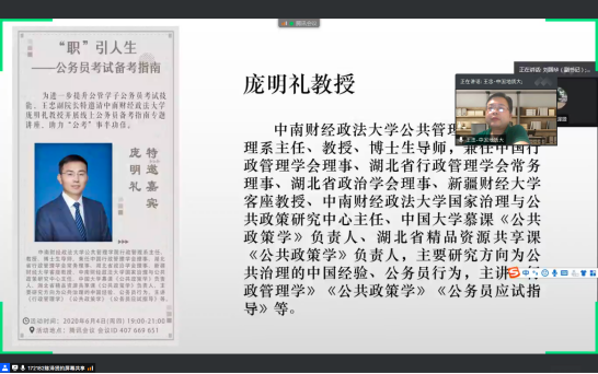 为进一步提升公司学子综合素养,促进同学们全面发展,6月4日晚,公司王忠副经理邀请中南财经政法大学庞明礼教授前来公司,在线开展公务员备考指南专题讲座