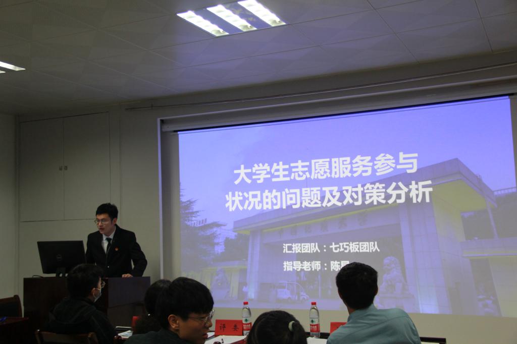 随后上场的是“七巧板队”,他们对老员工志愿服务参与状况的问题及对策进行了分析,得出对老员工志愿参与的积极性影响最大的是人际阻碍因素,并针对性地给出了他们的建议。在答辩中,小队成员针对评委老师提出问题,提出了“签保险保障志愿服务同学的安全”以及“创新发放志愿服务名额的方式”两个方案,得到了评委老师的肯定。