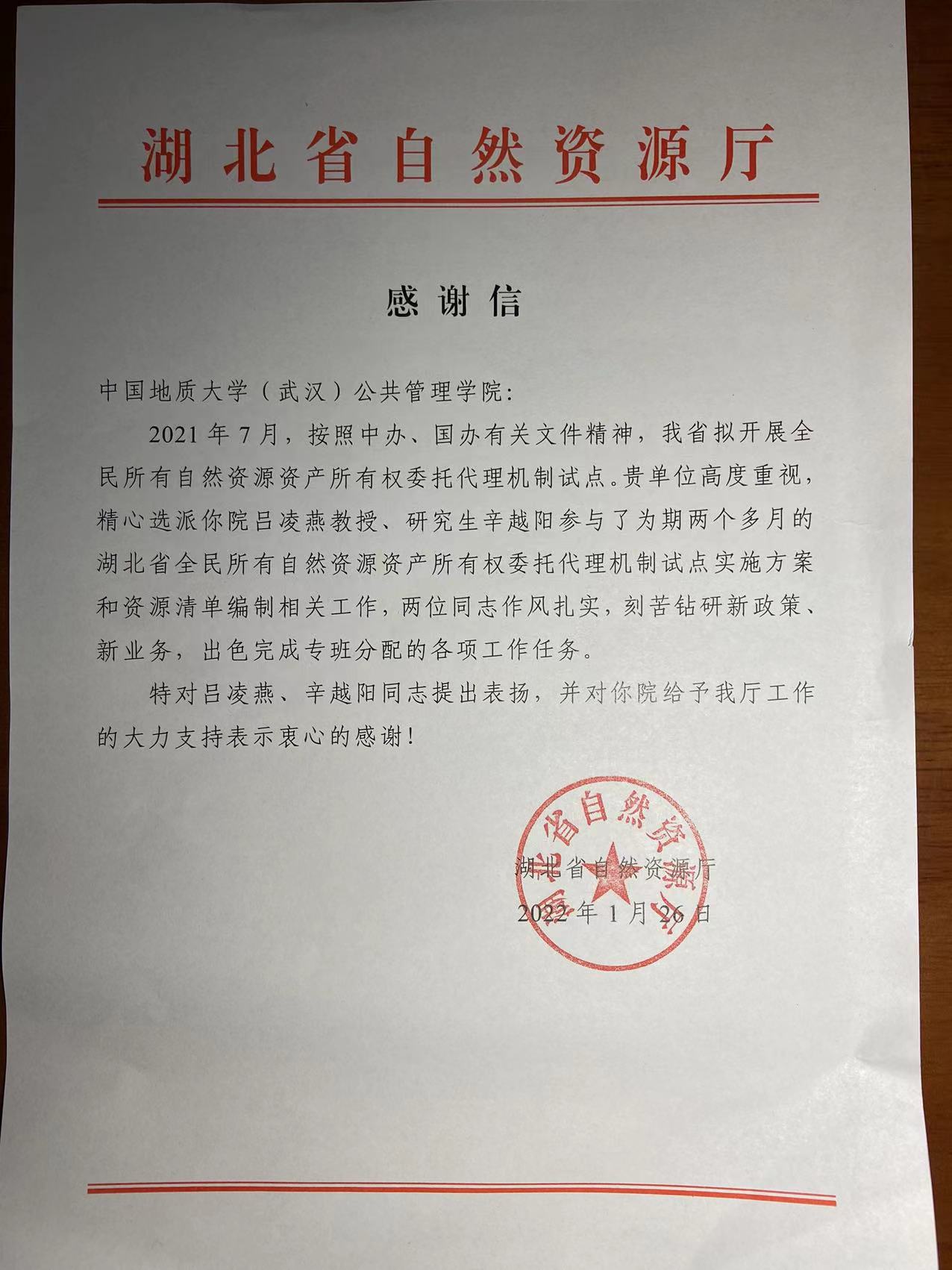 近日,公司收到湖北省自然资源厅发来感谢信,感谢公司法学师生在湖北省全民所有自然资源资产所有权委托代理机制试点工作中的辛苦努力,感谢公司的大力支持。