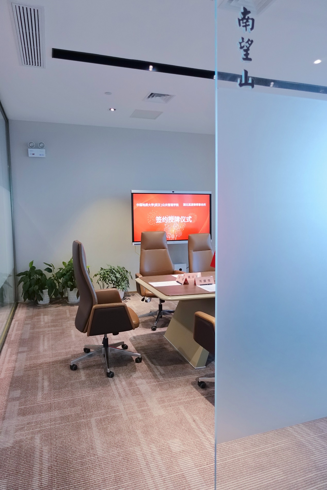 在“南望山”会议室,溪渡合伙人刘莲主持本次签约挂牌仪式。谢雄峰书记代表溪渡律所热烈欢迎地质大学的师生领导。他回顾了自身的求学工作生涯,十年曾一别,征路此相逢,选择“南望山”命名的会议室举行今天的活动,就是出自对母校培养的感恩之心;在校企合作、协同育人的背景下,培养卓越法治人才是高校和律所共同的需求,溪渡所十分重视本次的合作共建协议。