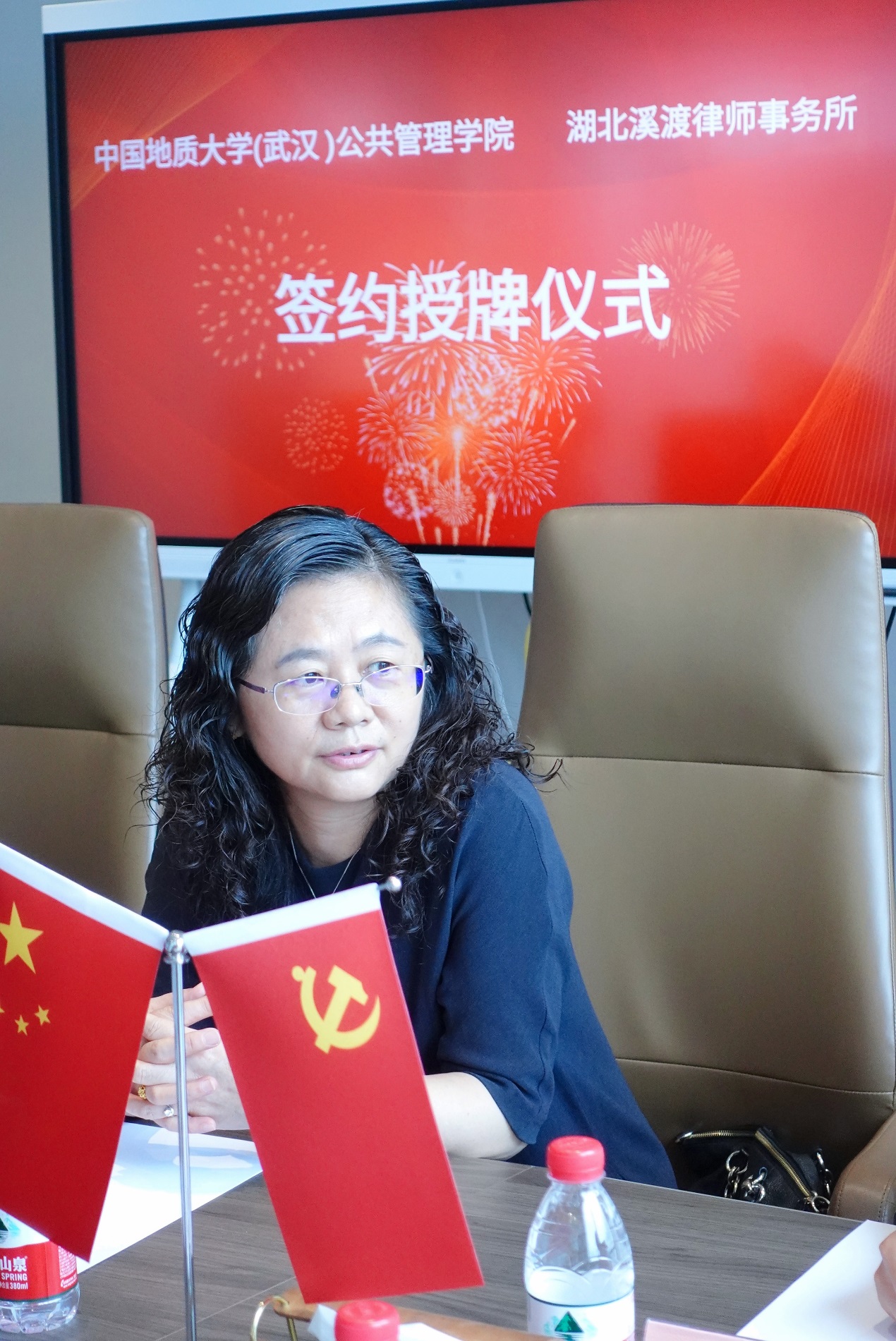 现挂职地质大公司办副主任的夏云娇老师,用视野、格局、情怀、雄心、成果、党建六个词高度概括了溪渡律所的特点与合作前景:临江见船的视野,胸纳高校的格局,渡人渡己的情怀,争做翘楚的雄心,签约授牌的成果,加强联合的党建。