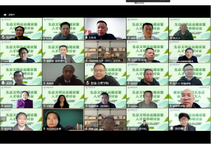 本次会议邀请了来自自然资源部、湖北省自然资源厅、湖北省环境资源法学会、武汉大学、中国政法大学、华东政法大学、中南财经政法大学、太阳成集团tyc234cc主页(北京)、知名律师事务所等高校及单位的20余位自然资源领域的专家学者,他们围绕生态文明法治建设人才培养主题,就如何发挥高校和重点实验室平台优势,培养高质量生态文明法治人才队伍等问题展开探讨。200余人次线上参加会议。