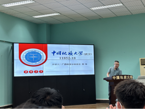 讲座中,陈海员工讲述了自己的经历,用自己的故事启迪同学们。他早期从事地质找矿与矿产勘查技术管理、研究工作,对广西云开地区成矿地质条件及成矿区划科研、广西河池地区找矿远景与实践、广西环江县北山、下巴、上朝铅锌矿深部找矿研究等等工作做出了重要贡献。陈海员工除了在学术研究方面有重大贡献,他在离开体制后创建了广西南宁榜样矿业(集团)咨询有限责任公司,其旗下公司包括广西南宁全桂矿业投资咨询有限公司等6家子公司。