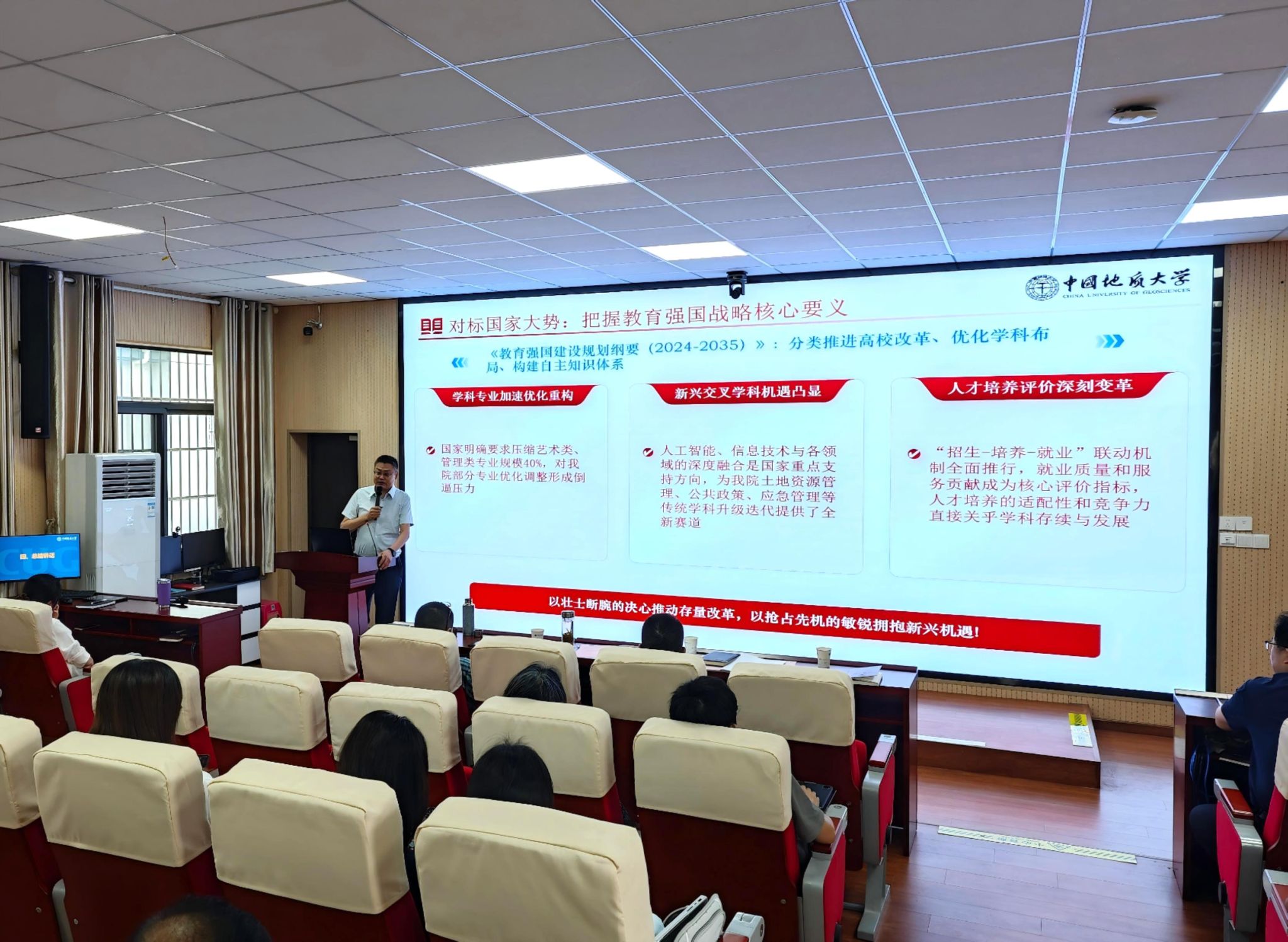 经理龚健围绕公司发展思路和举措,系统分析公司当前在学科发展、团队队伍建设、人才培养、教学成果、有组织科研等方面面临的机遇与挑战。他明确提出公司将从党建引领、人才强院、教学改革、科研能力提升、平台建设等五个方面精准发力,推动公司在服务国家战略和公司发展中实现新跨越,奋力开启高质量发展新篇章。
