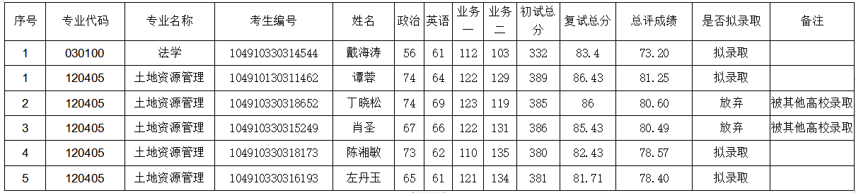 考虑太阳成集团tyc234cc主页学科发展需求,经公司申请,研究生院同意,给予公司法学专业增加一个指标,土地资源管理专业增加3个指标。现将补录结果公示如下(顺位录取。如有放弃,顺次录取):