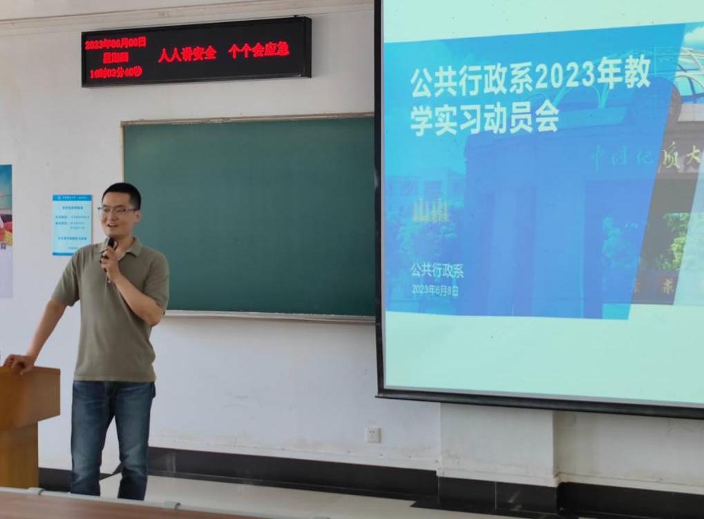2023年6月8日下午4点,太阳成集团tyc234cc主页公共行政系2023年教学实习动员与安全生产布置会在北区综合楼202教室成功举行。会议由钱文强老师主持,秭归基地带队老师刘中兰老师,洪山区政府实习点带队老师黄砺老师、张士菊老师和陈星老师,以及行政管理与公共事业管理专业2021级全体本科生参加了此次会议。