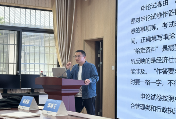 刘广现为某军事院校教员,他首先介绍了申论考试中的注意事项、常见题型和阅卷标准,接着选取了几道代表性的申论题目进行现场讲解。在讲解过程中不仅指导大家如何准确分析题目的要求,还展示了如何构建条理清晰、逻辑严谨的答案框架,让同学们受益匪浅。